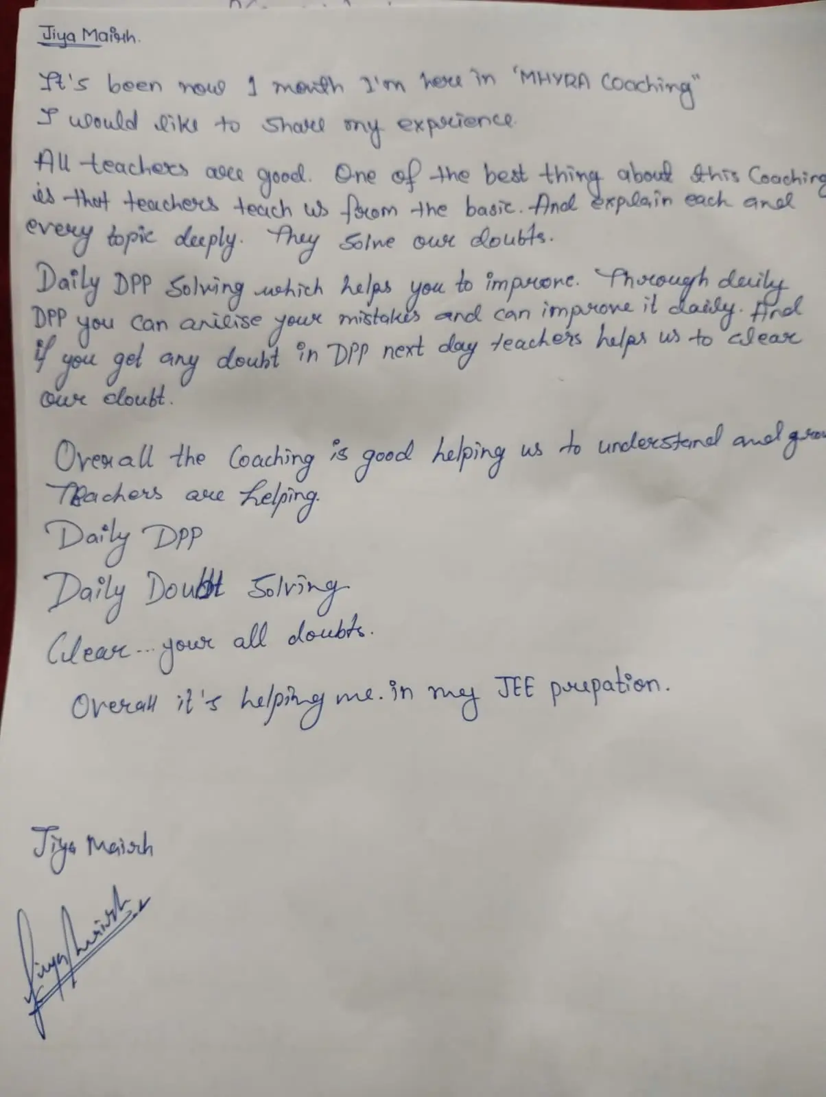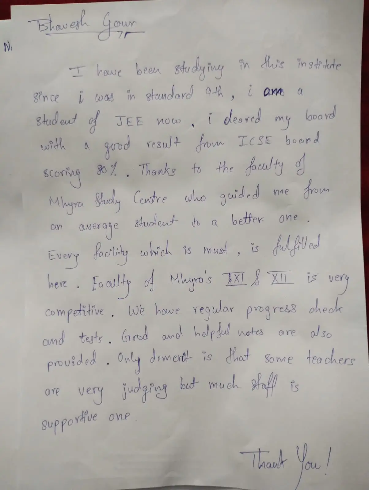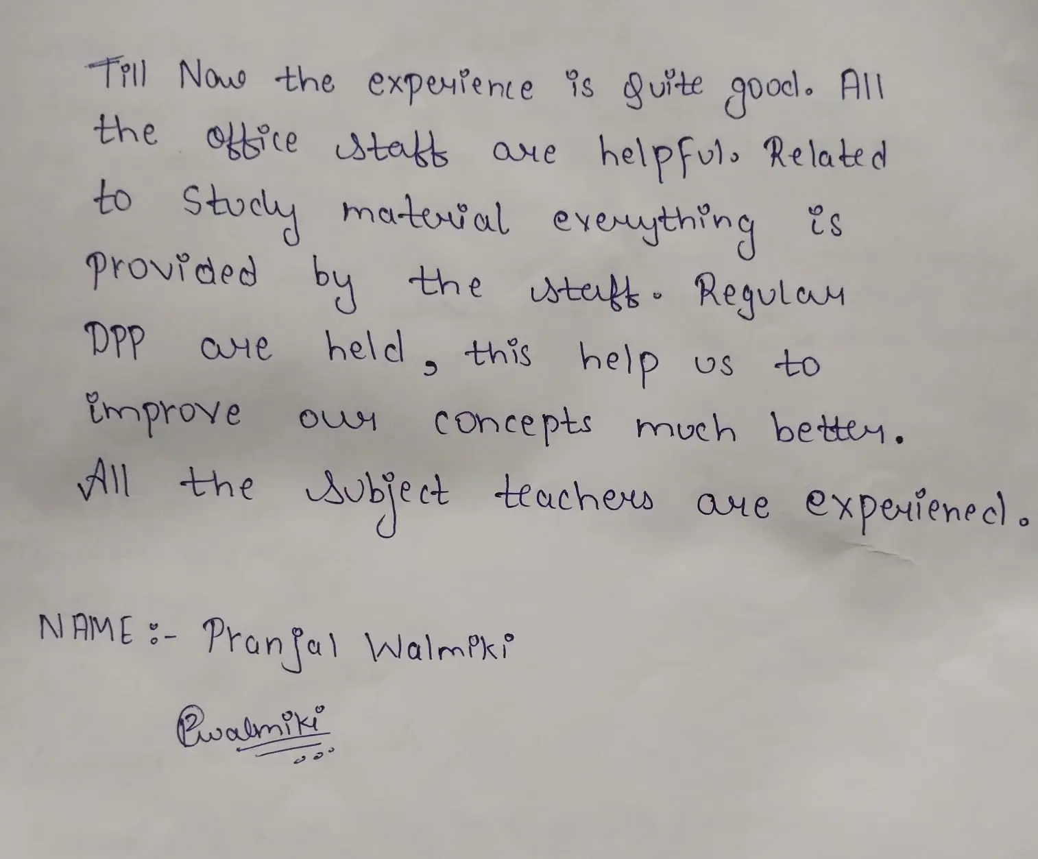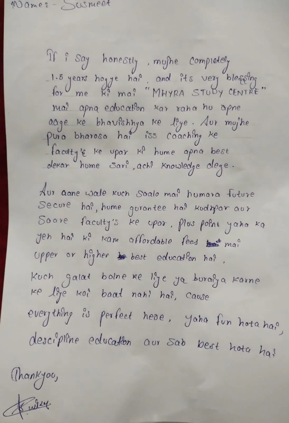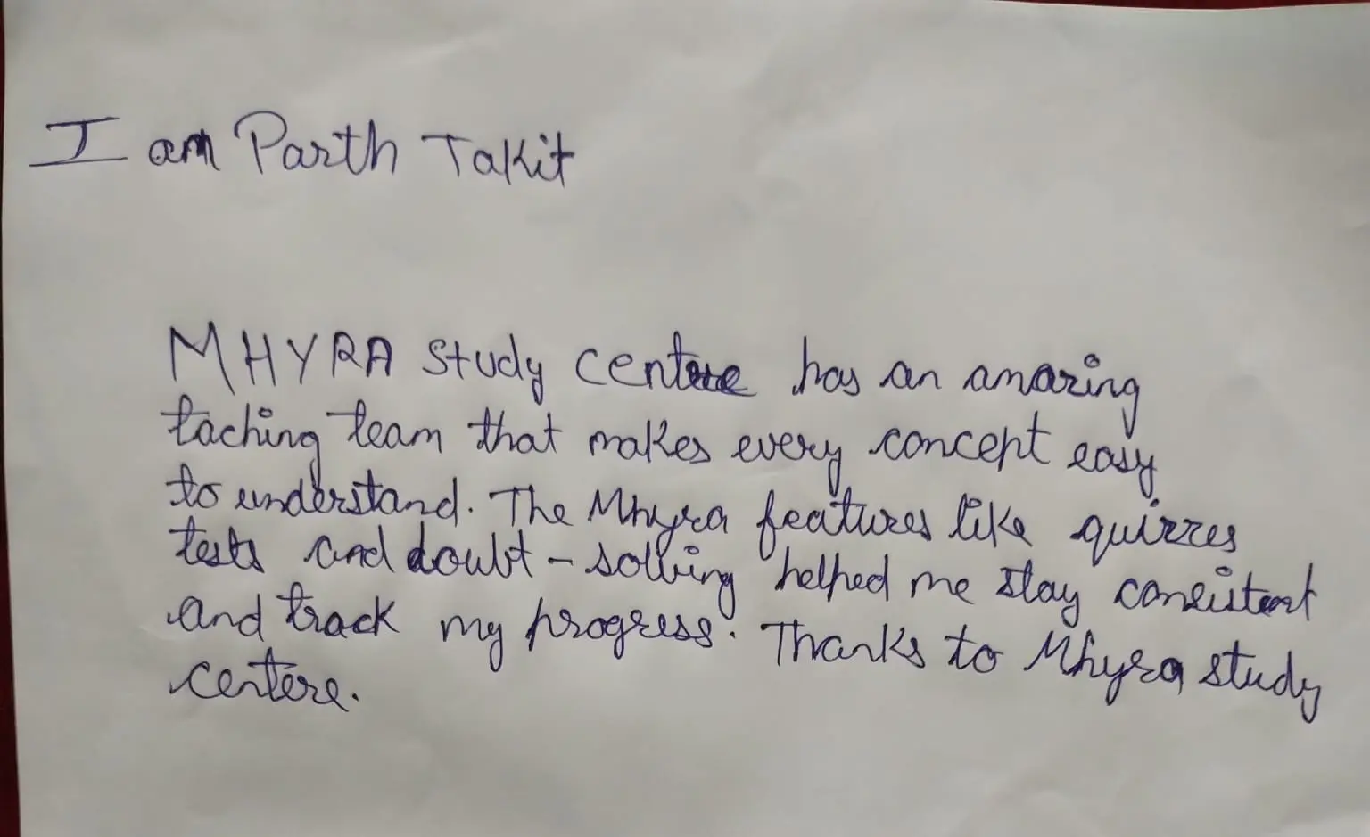 Hand Written Testimonials of our Student's